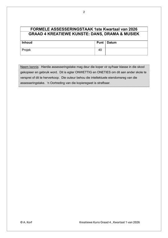 Dans Drama Musiek (DDM) Gr. 4 Assesseringstaak 2026 Kwartaal 1