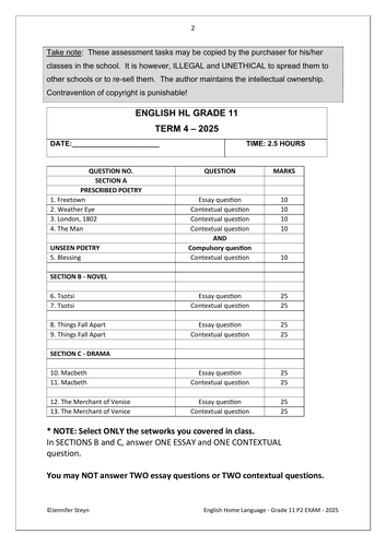 English Home Language Gr. 11 Assessment Task 2025 Term 4 Paper 2 quantity