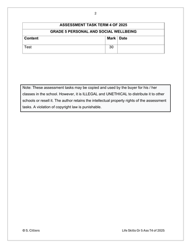 / Life Skills (PSW) Gr. 5 Assessment Task 2025 Term 4