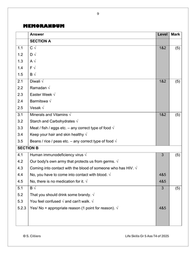 Life Skills (PSW) Gr. 5 Assessment Task 2025 Term 4