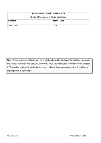 / Life Skills (PSW) Gr. 8 Assessment Task 2025 Term 4