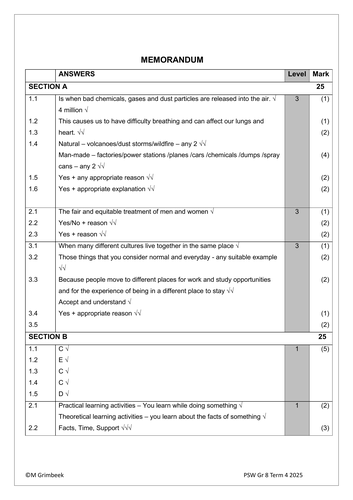 Life Skills (PSW) Gr. 8 Assessment Task 2025 Term 4 quantity