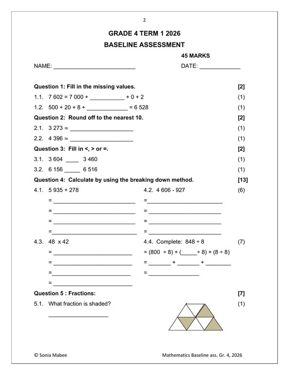 Mathematics Gr. 4 Baseline assessment 2026Mathematics Gr. 4 Baseline assessment 2026