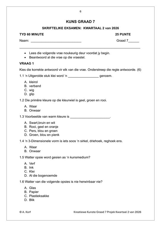 Visuele Kuns Gr. 7 Assesseringstaak 2026 Kwartaal 2Visuele Kuns Gr. 7 Assesseringstaak 2026 Kwartaal 2