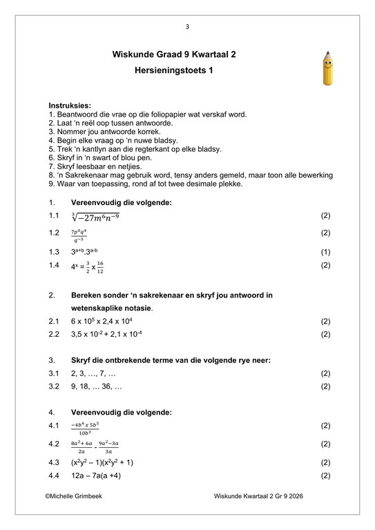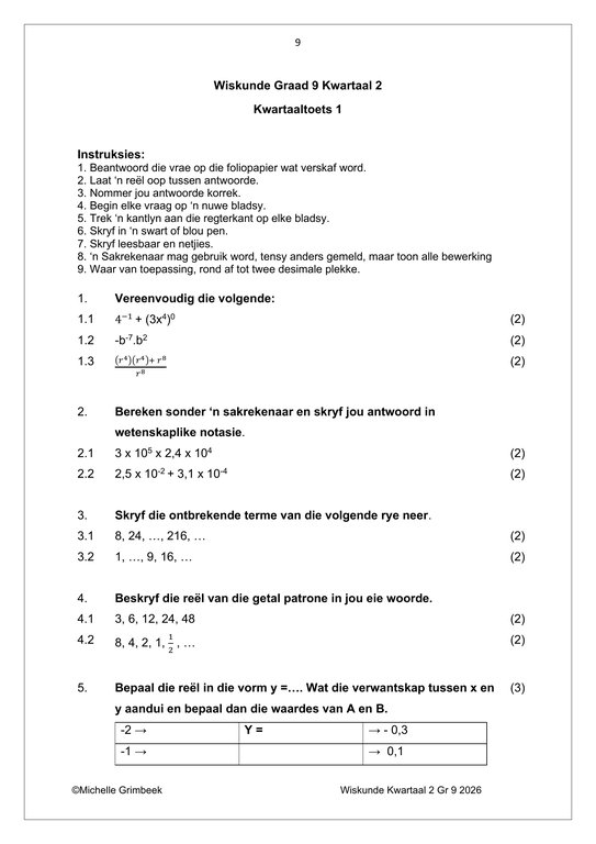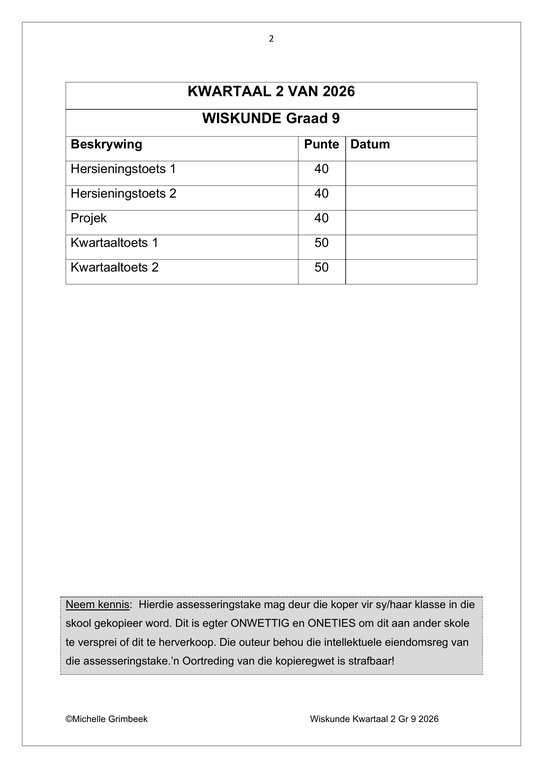 Wiskunde Gr. 9 Assesseringstaak 2026 Kwartaal 2Wiskunde Gr. 9 Assesseringstaak 2026 Kwartaal 2